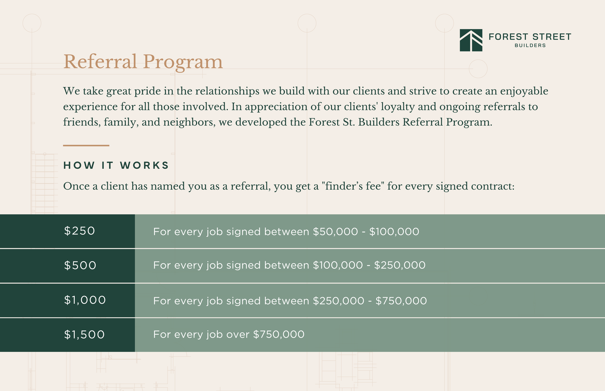 A kitchen remodel carries a different level of scope and coordination than a full home renovation or custom build. Our tiered structure reflects that difference and ensures the referral fee scales appropriately with the investment.